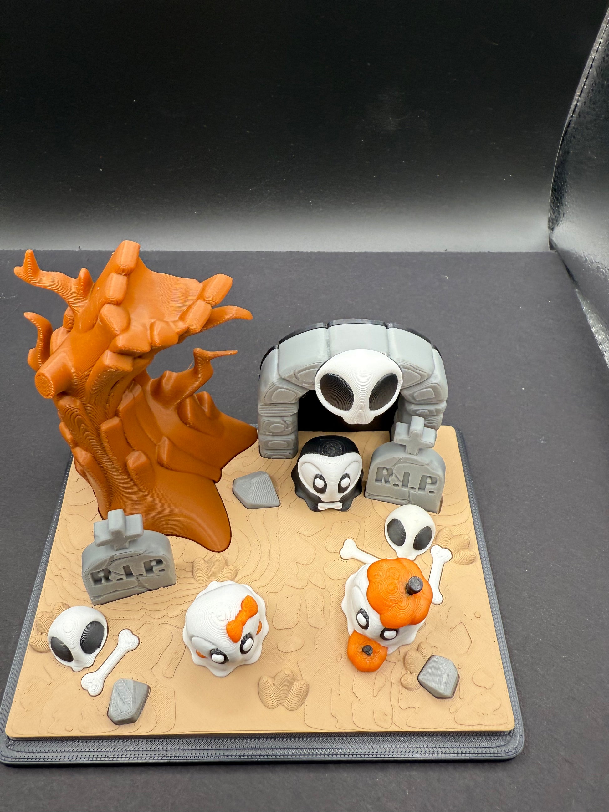 Spook up your shelf, desk, or diorama with this hauntingly adorable Graveyard and Mini Ghosts set! Featuring 3 mini ghost pocket friends, this 3D printed collectible set is perfect for Halloween decorating, imaginative play, or adding a tiny dose of spooky-cute charm to any space.