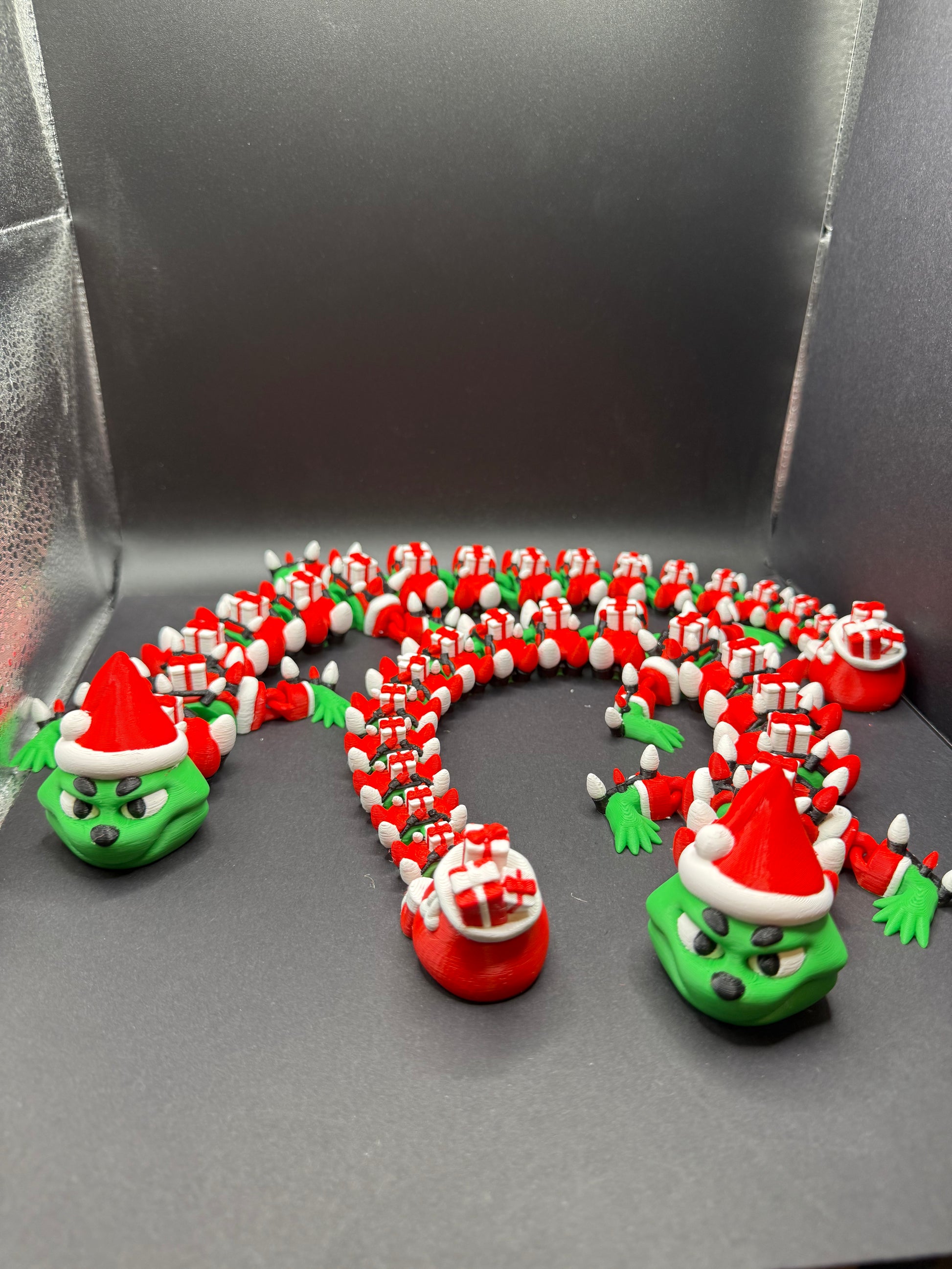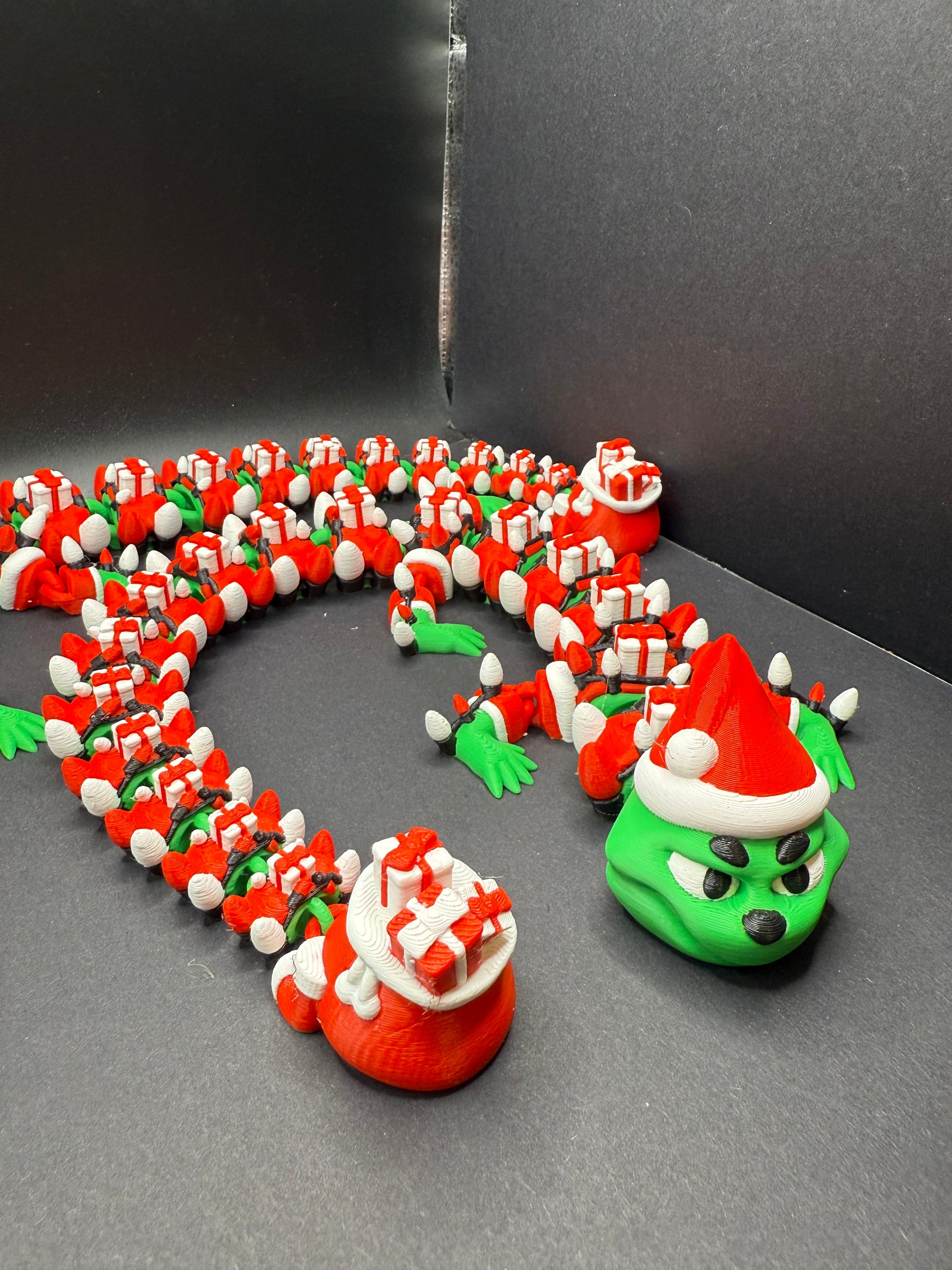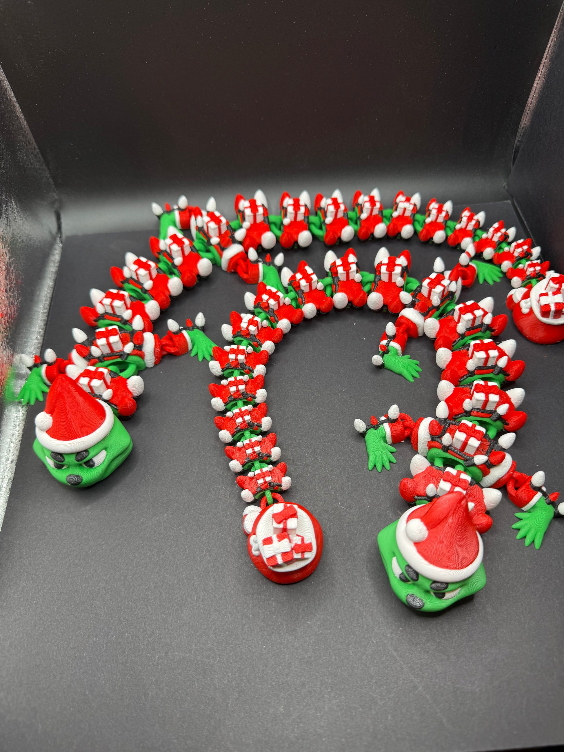 Meet the mischievously merry Grinch Dragon, a playful twist on a Christmas classic! With a gift-toting tail and a heart full of holiday cheer (and a little mischief), this dragon brings a fun and festive vibe to your décor. Featuring rich green and red details, it’s 3D printed with eco-friendly PLA for a magical and sustainable holiday touch. Perfect for collectors, dragon lovers, and Grinch fans alike!